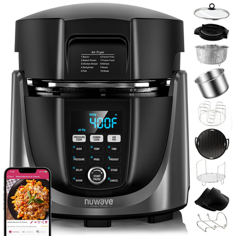 Nuwave Duet Air Fryer, Electric Pressure Cooker & Grill Combo, 540 IN 1 Multicooker with 3 Removable Lids that Slow Cook, Sears, Sautés, 18/10 SS Pot, Sure-Lock Safety Tech & 10 Deluxe Accessories